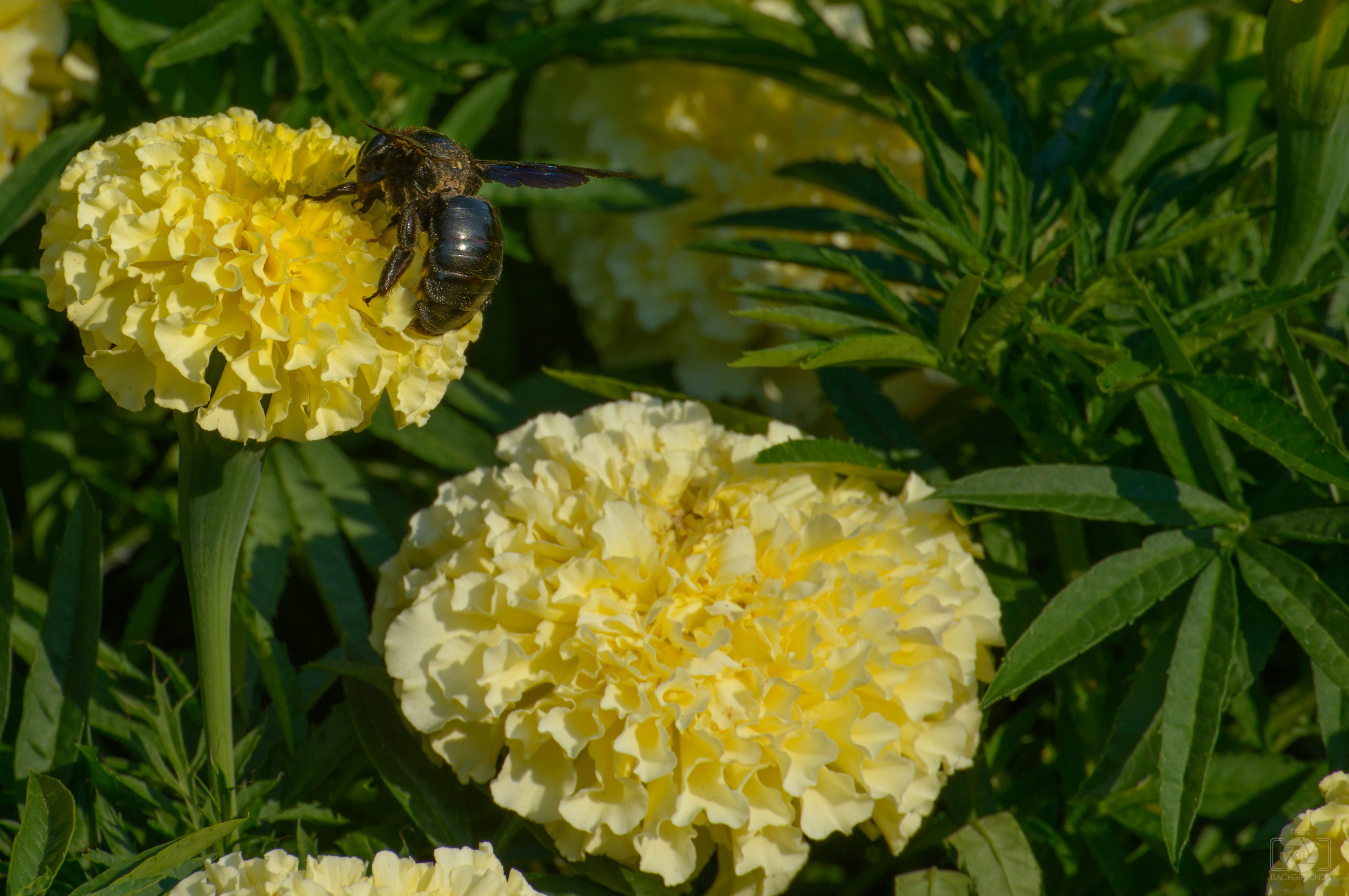 Image Resolution: 4812 x 3197 px.Image Link:https://pics.freeartbackgrounds.com/midle/Carpenter_Bee_on_Yellow_Marigold_Flower_Background-1093.jpg