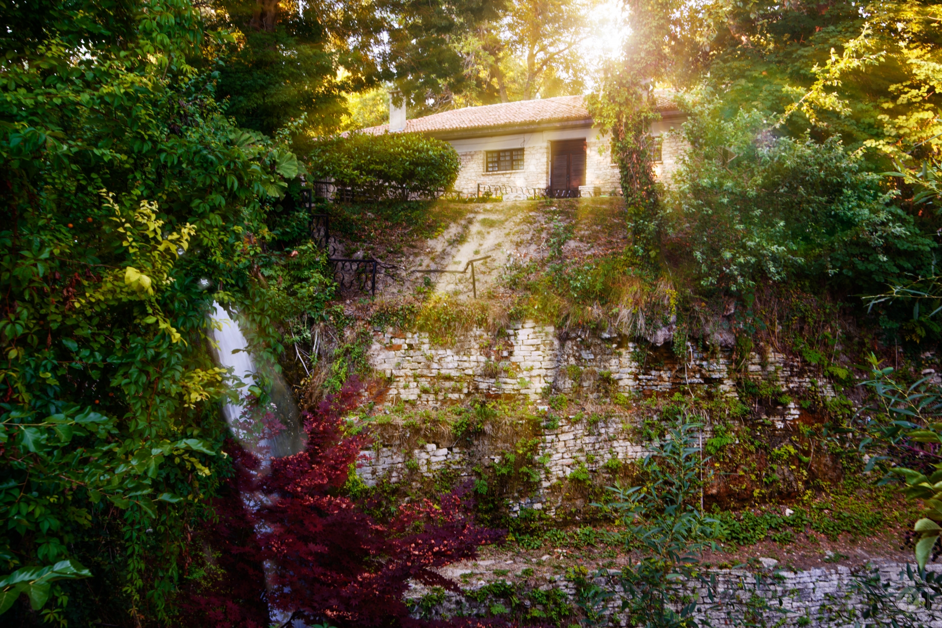 House Bathed in Sunlight Near Waterfall Background
