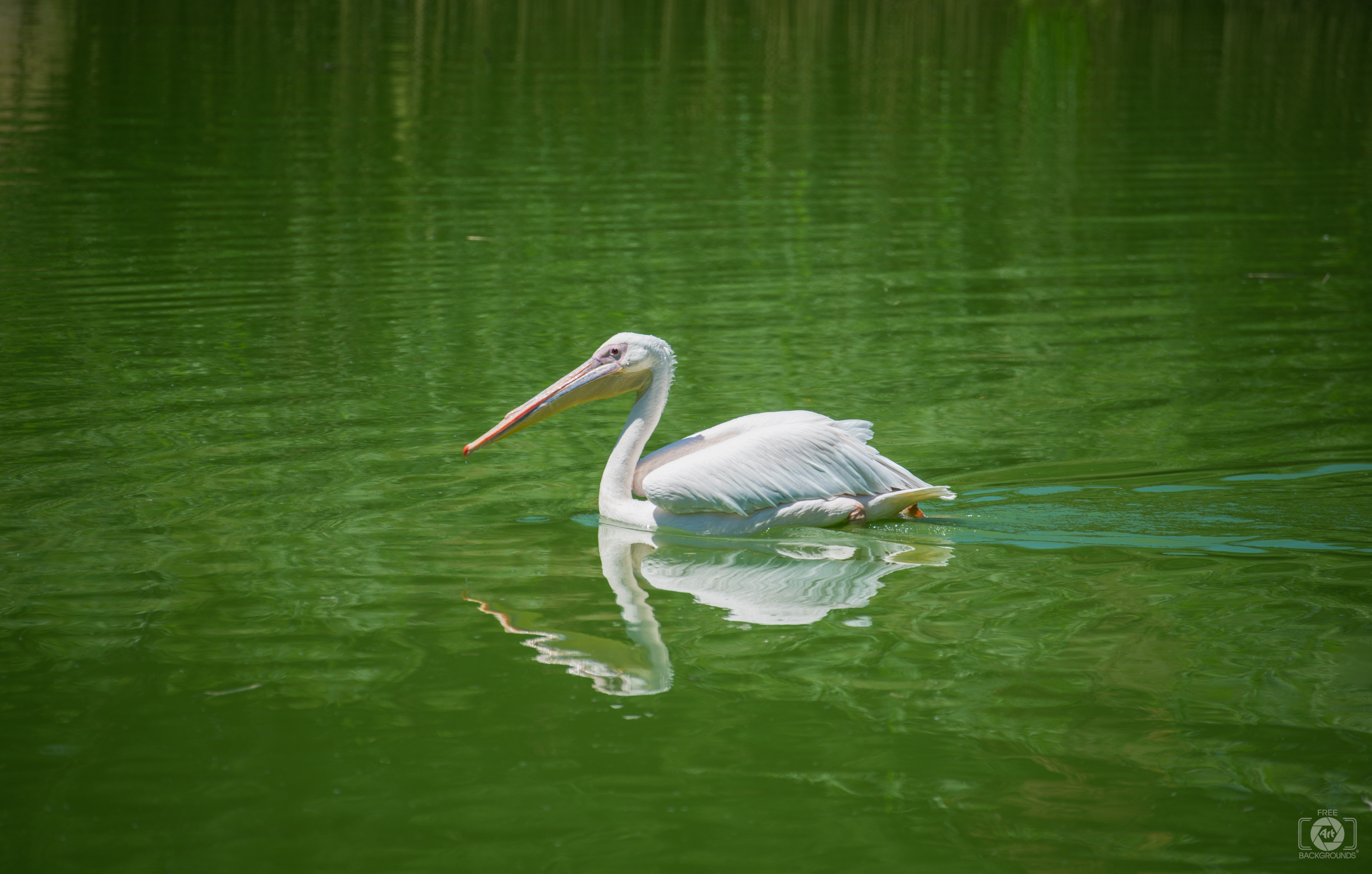 Image Resolution: 7337 x 4679 px.Image Link:https://pics.freeartbackgrounds.com/midle/Great_White_Pelican_Swimming_on_Lake_Background-71.jpg