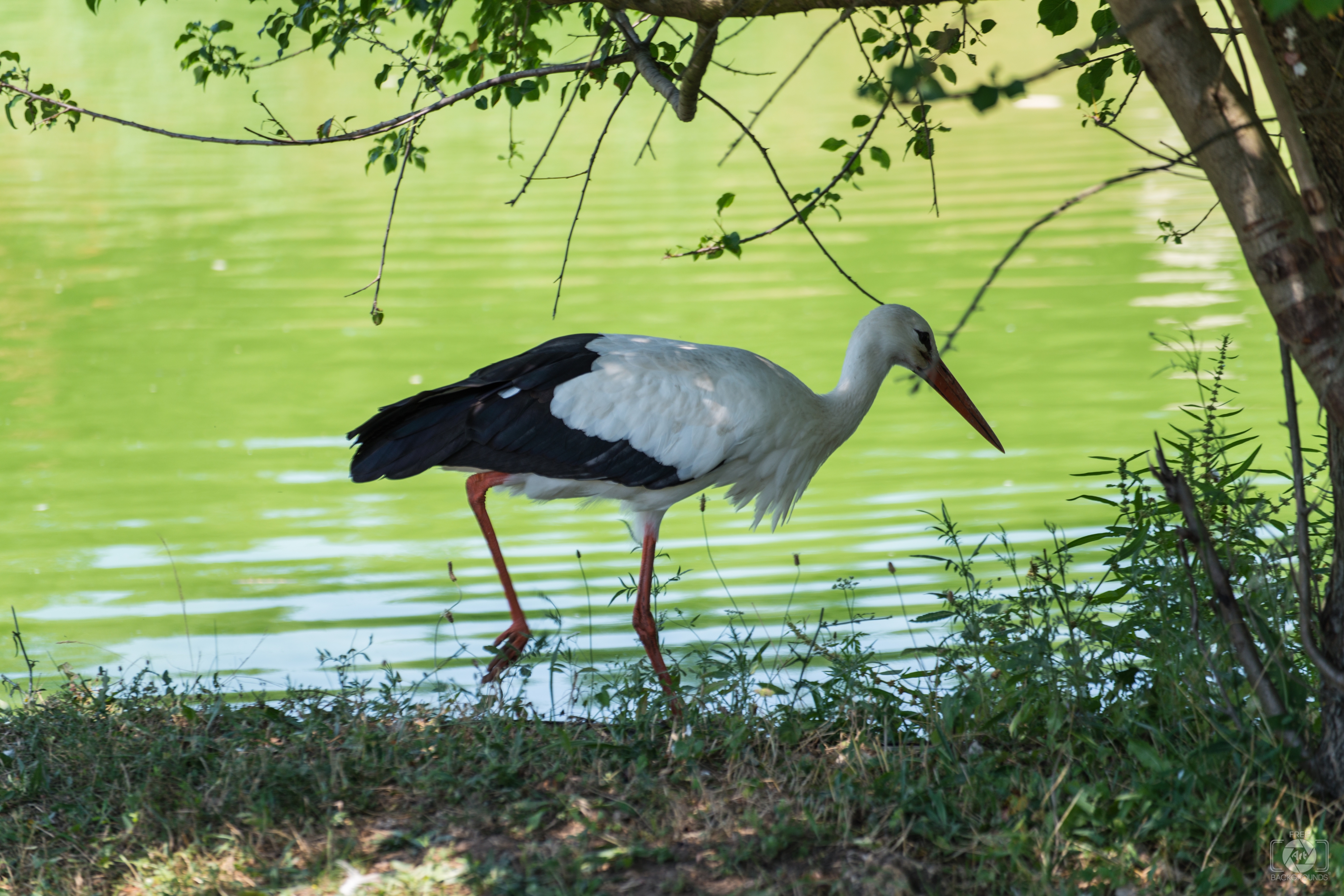 Image Resolution: 7360 x 4912 px.Image Link:https://pics.freeartbackgrounds.com/midle/Stork_by_a_Lake_Background-91.jpg