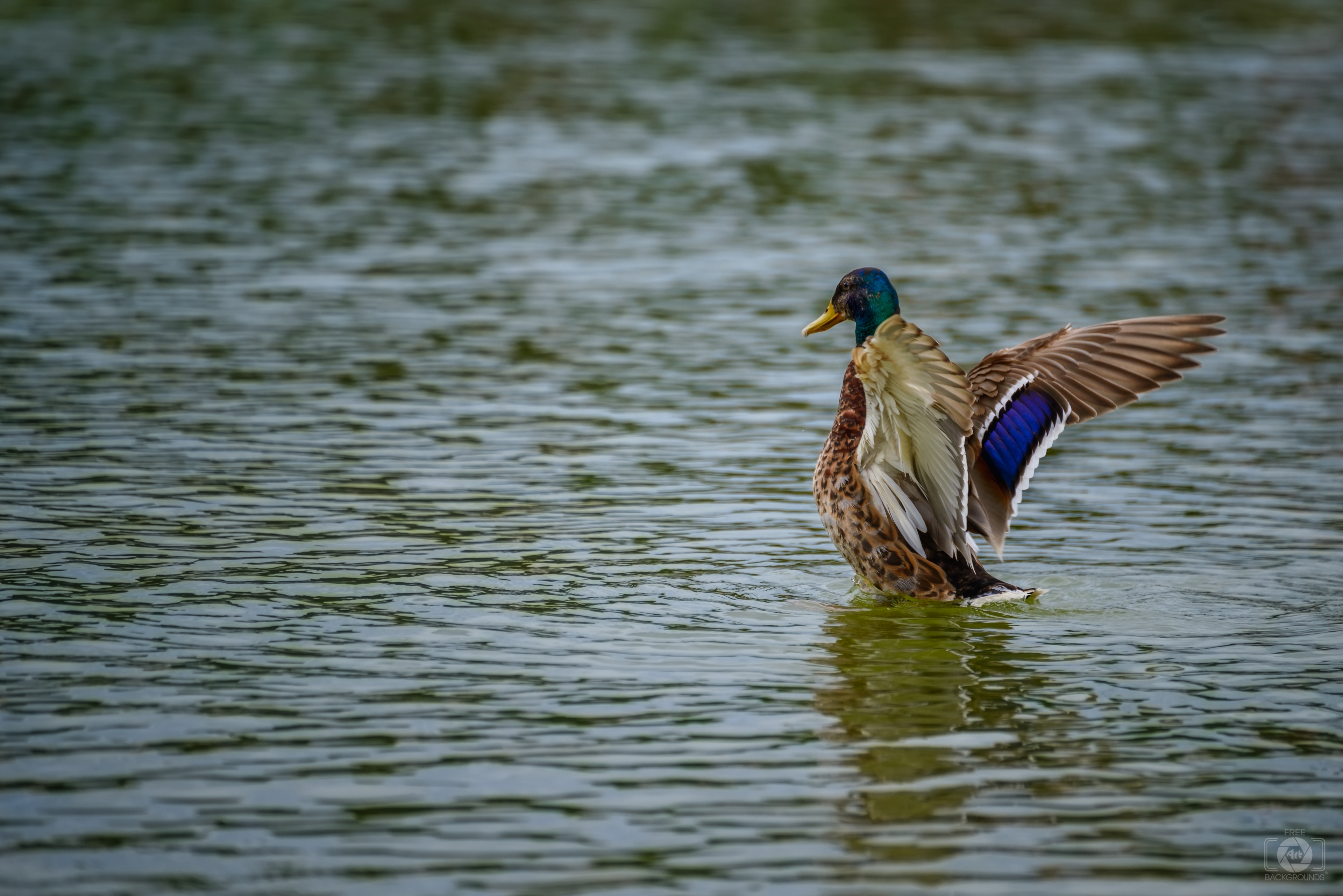 Image Resolution: 6809 x 4544 px.Image Link:https://pics.freeartbackgrounds.com/midle/Mallard_Duck_in_Lake_with_Wings_Spread_Background-931.jpg
